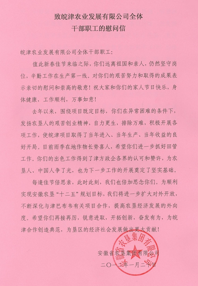 安徽农垦集团致信慰问皖津公司全体员工