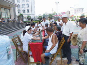 为确保全场职工的身体健康,9月1日,华阳河农场医院请安庆市第二人民医院外科专家及宿松县人民医院的内科专家来场为广大职工进行义诊。义诊期间的各种检查费优惠40%,这一举措吸引了众多老年同志前往参加。(图为义诊时的场面)