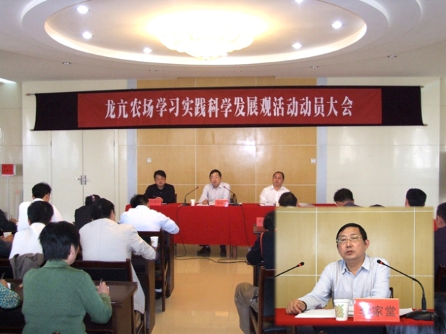 10月20日,龙亢农场召开学习实践科学发展观活动动员大会,动员部署开展学习实践科学发展观活动,全场各党总支、支部书记、机关全体党员参加大会,皖垦食品集团公司及龙亢农场领导和党委委员出席大会,皖垦食品公司董事长、总经理、龙亢农场党委书记李家堂作动员讲话,皖垦食品集团公司副董事长、龙亢农场场长、党委副书记杨俊宇主持大会。