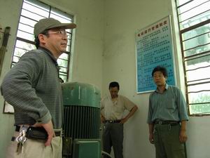 随着淮河主汛期的临近,潘村湖农场按照集团公 司防汛抗旱会议精神,早动员、早安排,积极做好 防汛抗旱各项准备工作。5月31日,场党委副书记 林贤传亲率各分场主要负责人和场防指办公室有关 人员对全场汛前准备工作及苏堤农场段除险加固工 程进行了一次检查。图为林贤传同志(左一)率检 查组在一分场电站察看试机情况。(杨登宏摄)