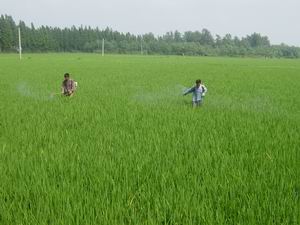 近日,大圹圩农场农业分场职工不畏炎热天气,积 极按照农场要求,认真抓好水稻田间管理,尤其是 条纹叶枯病防治工作。+去年条纹叶枯病给个别分场 家庭农场户带来较大损失,教训惨痛。今年农场及 早安排,从水稻育秧开始就下大气力狠抓综合防治 工作。一方面,要求农技部门严格植保人员责任, 切实抓好病虫测报及农药供应服务工作;另一方 面,要求各分场农技员按测报要求挨家挨户指导家 庭农场户科学合理防治,并认真做好防治效果调 查,加大督促指导力度。由于措施得力,目前全场 水稻条纹叶枯病防控效果较好。图为农业分场职工 正统一施药防治三代灰飞虱。(杨朝幸)